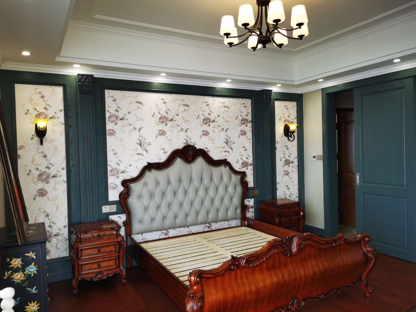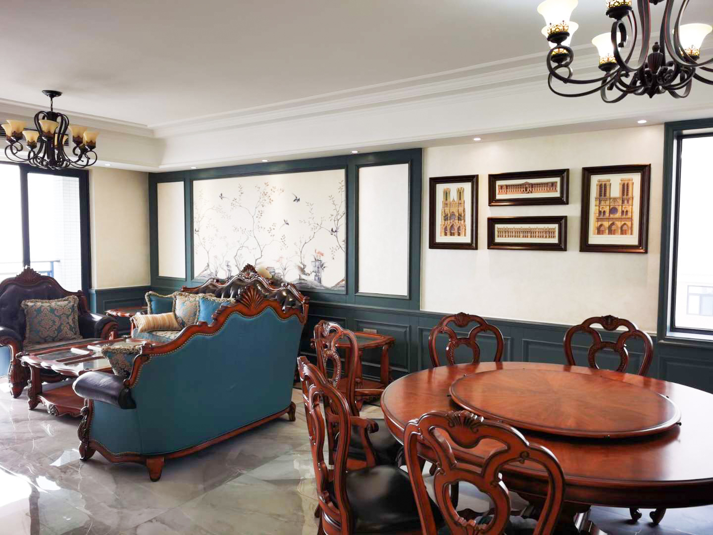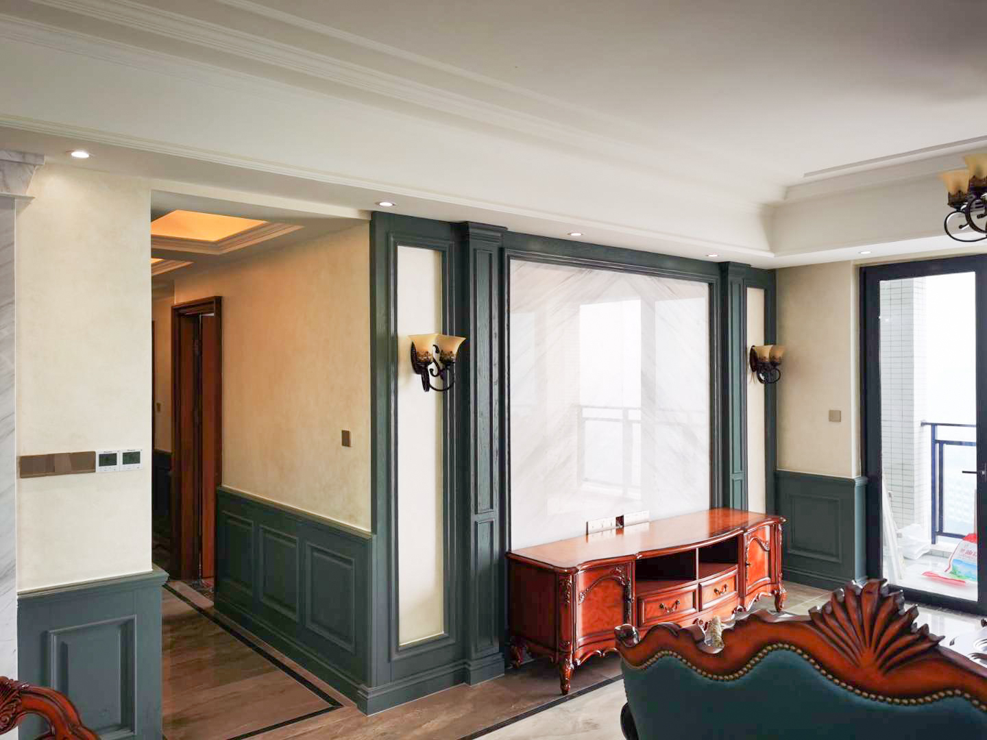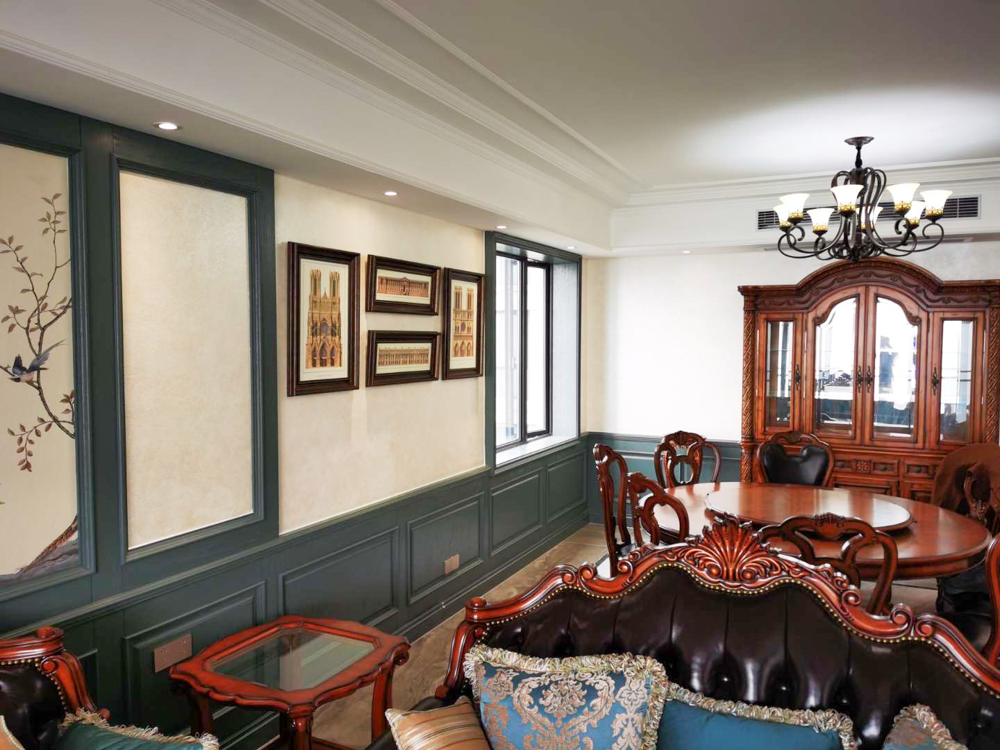 采用墨绿色的护墙板,流畅的线条修饰,淡雅中又显得沉稳。